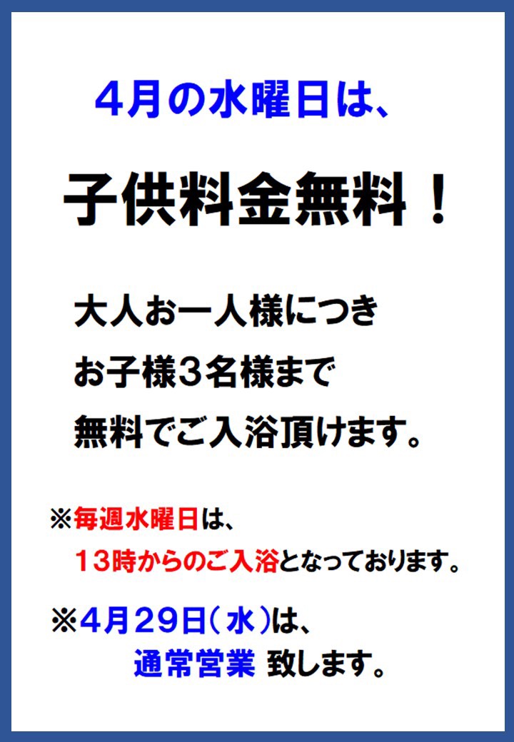 大人1人様につき子供3名様まで無料でご入浴できます